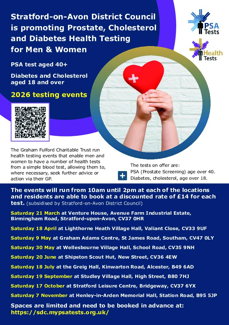Stratford on Avon District Council are continuing their support for health screening in our district. For a small fee and a blood test you can be checked for Prostate health, Cholesterol and Diabetes. Testing will be carried out in Alcester at the Greig Hall on Saturday 18th July. But you need to book as spaces are limited. Getting an early diagnosis can save lives and years of ill health. Book your space now. To book your space click here  https://sdc.mypsatests.org.uk